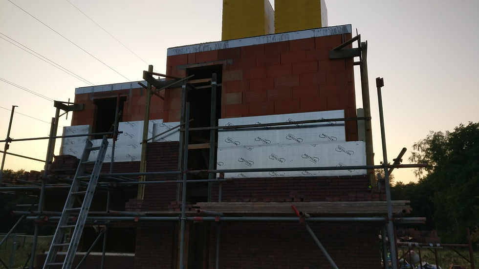 Voor ons rest er dan niks anders meer als de gevel netjes af te werken want daar is nog erg veel werk aan. Omdat er nog een klein beetje lijm over is gaat Kevin daar mee verder en ik neem de voegspijker en de borstel en begin de véle voegen uit te krabben. Daar ben ik nog een 2 uurtjes zoet mee en tegen die tijd is Kevin ook klaar met zijn werk. De lijm is op, de ankers zijn geboord en klaargezet waar nodig en de isolatie staat hoog genoeg voor komende week.